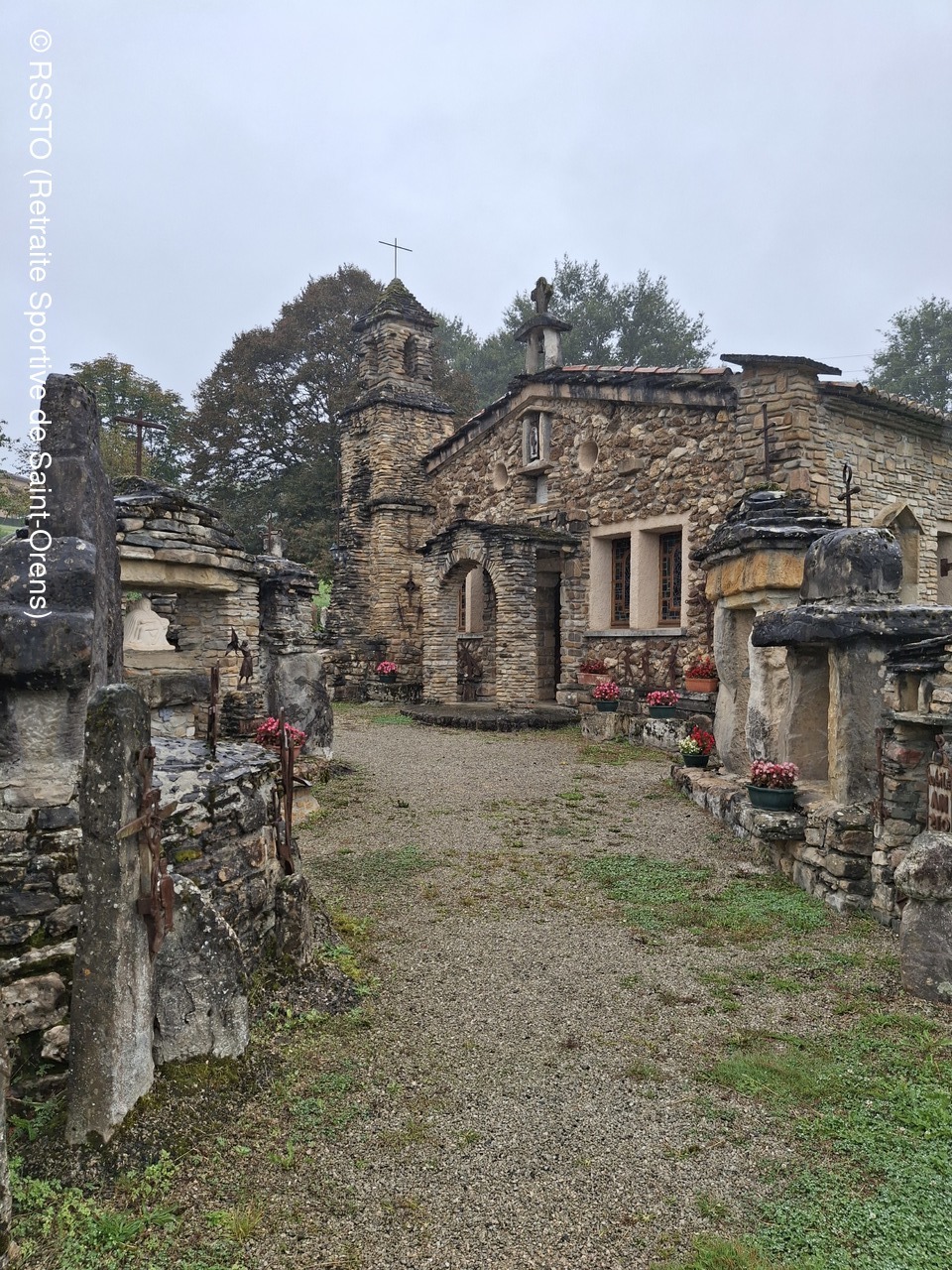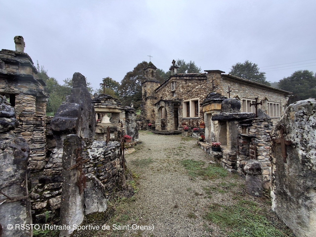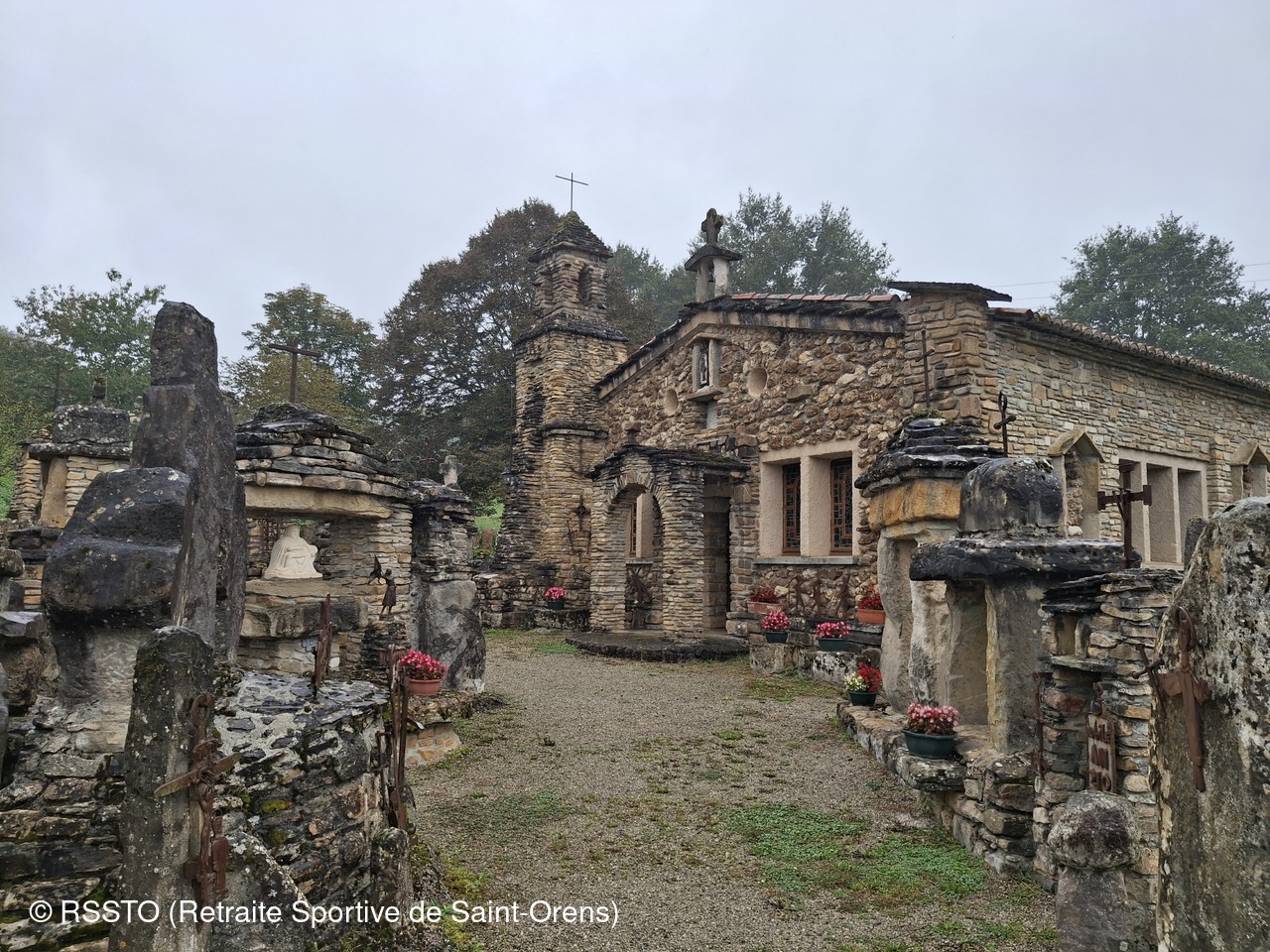 Pour ce jeudi 23 septembre 2024, 10 randonneurs étaient présents à Mauvezin-de-Ste-Croix en Ariège. Beau temps jusqu'à 11h20 puis une pluie fine nous a accompagnée pendant 4 heures jusqu'à la fin de la rando longue de 18.4km. Avant de prendre le pot de l'amitié à Cazères, José nous a fait découvrir à Montardit la chapelle de Notre Dame de la Goutte, une construction curieuse et insolite construite entre 1968 et 2001 par l’Abbé Jean-Marie Piquemal.