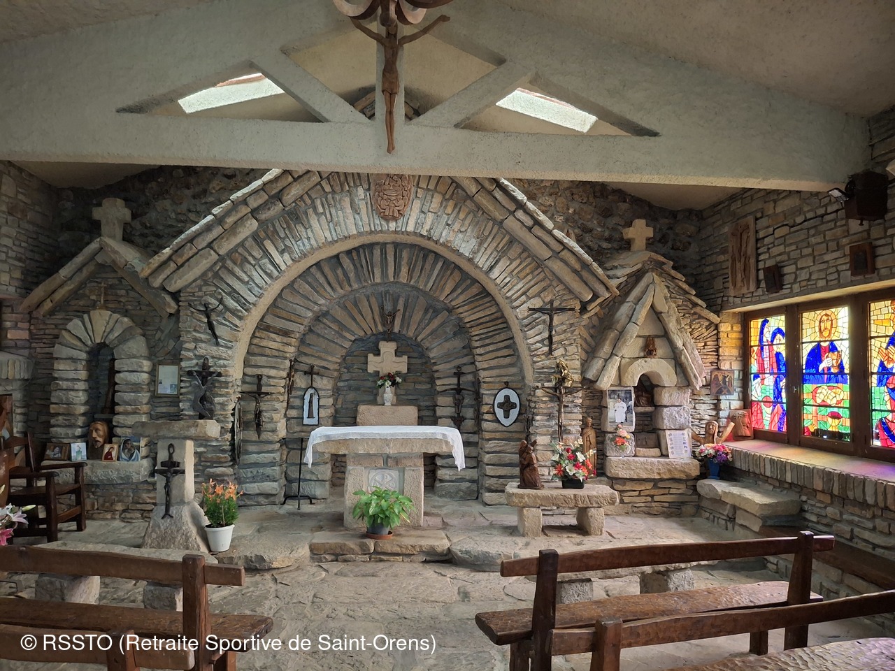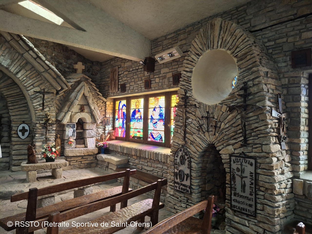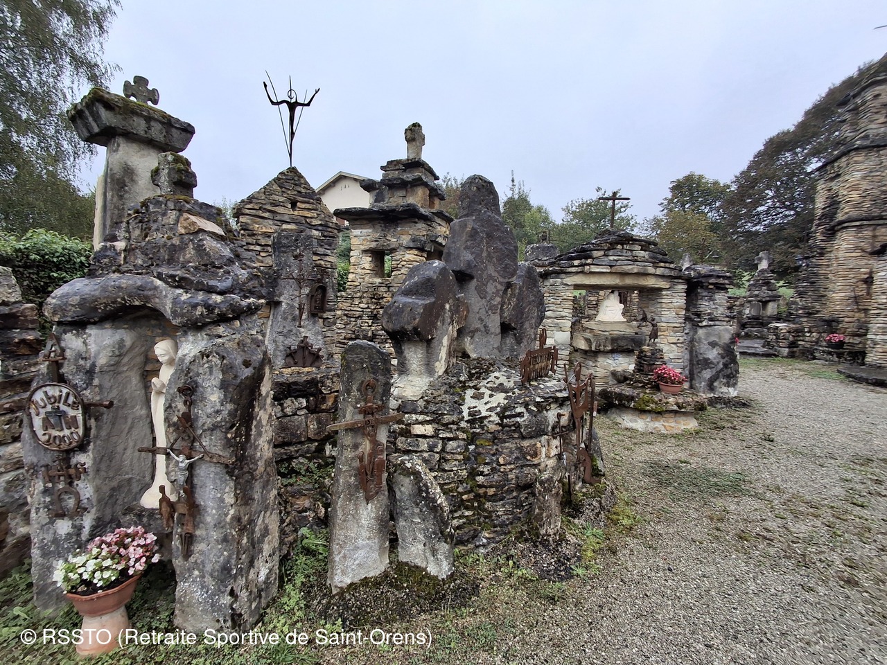 Pour ce jeudi 23 septembre 2024, 10 randonneurs étaient présents à Mauvezin-de-Ste-Croix en Ariège. Beau temps jusqu'à 11h20 puis une pluie fine nous a accompagnée pendant 4 heures jusqu'à la fin de la rando longue de 18.4km. Avant de prendre le pot de l'amitié à Cazères, José nous a fait découvrir à Montardit la chapelle de Notre Dame de la Goutte, une construction curieuse et insolite construite entre 1968 et 2001 par l’Abbé Jean-Marie Piquemal.